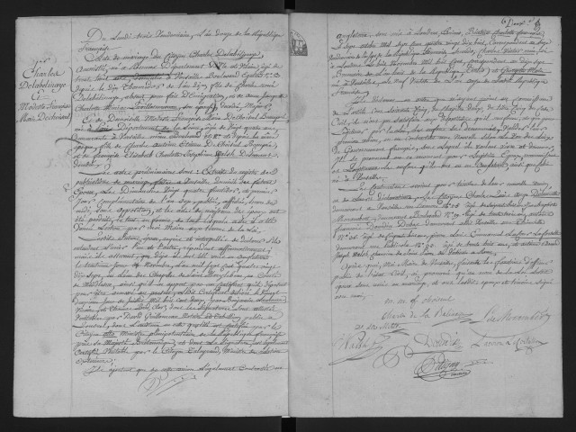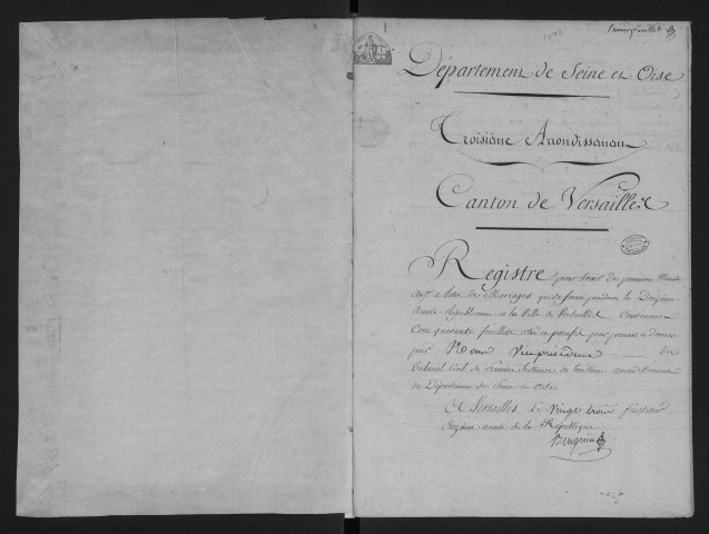 A noter : la première page du registre annonce "registre pour servir de première minute aux actes de mariages". Ce registre comporte en réalité des actes de mariages, de divorces et d'adoptions.