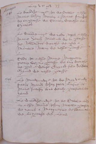 A remarquer : Premier acte de mariage, daté du 8 octobre 1545. Mariage de Jehan Moulin et Marie Fancher (folio 73)