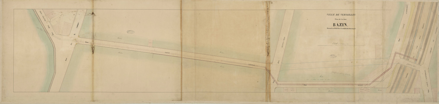 Ville de Versailles. Bazin (rue).Grands-Bois (rue des), Ceinture (rue de la), Saint-Nicolas (rue), Petits-Bois (rue des), Saint-Symphorien (rue). Chemin de culture, chemin de fer Rive-Droite, pont en bois.