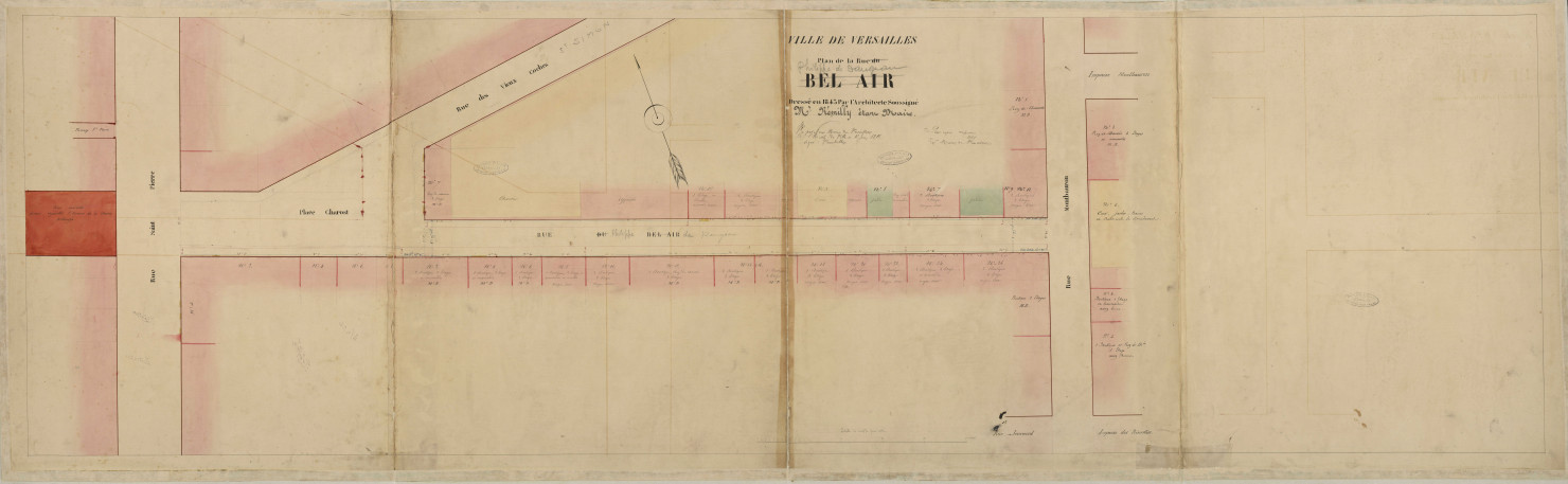 Ville de Versailles. Bel-Air (rue du).Saint-Pierre (rue), Vieux-Coches (rue des), Charost (place), Montbauron (rue), Jouvencel (rue de), Réservoirs (impasse des), Montbauron (impasse).